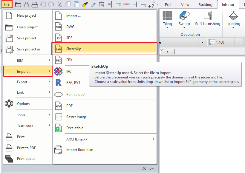 - Importieren Sie die Datei in ARCHLine.XP über das Menü Datei - Importieren - SketchUp.