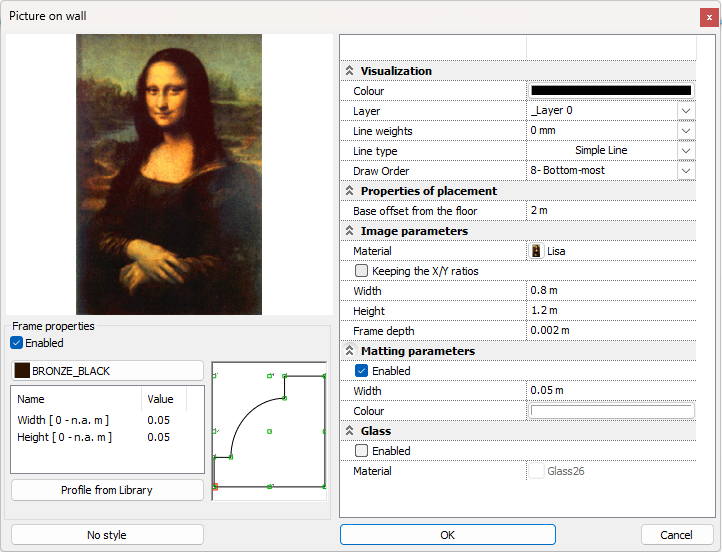 The Picture on the wall is a dynamic object that can be configured with its parameters in a few steps. With this feature you can easily place images on different surfaces in your interior spaces.