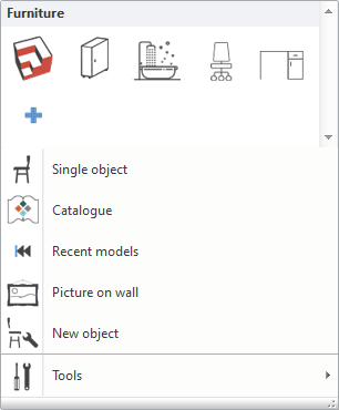Folders, functions and commands related to objects are available here. Whether you want to place an existing object in the project, download a new object from the Internet or save a new object in the library, you can easily access the related options from this menu.