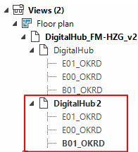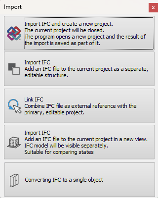 Add an IFC file to the current project in a new view. IFC model will be visible separately. A level is created for each IfcBuildingStorey in the IFC file. Floors are created with the name of IfcStorey appended. This option is used if you are already working on a project and want to open a new view where you import the IFC model, some of which you may want to use later and copy from this window to your floor plan. Suitable for comparing states too. |