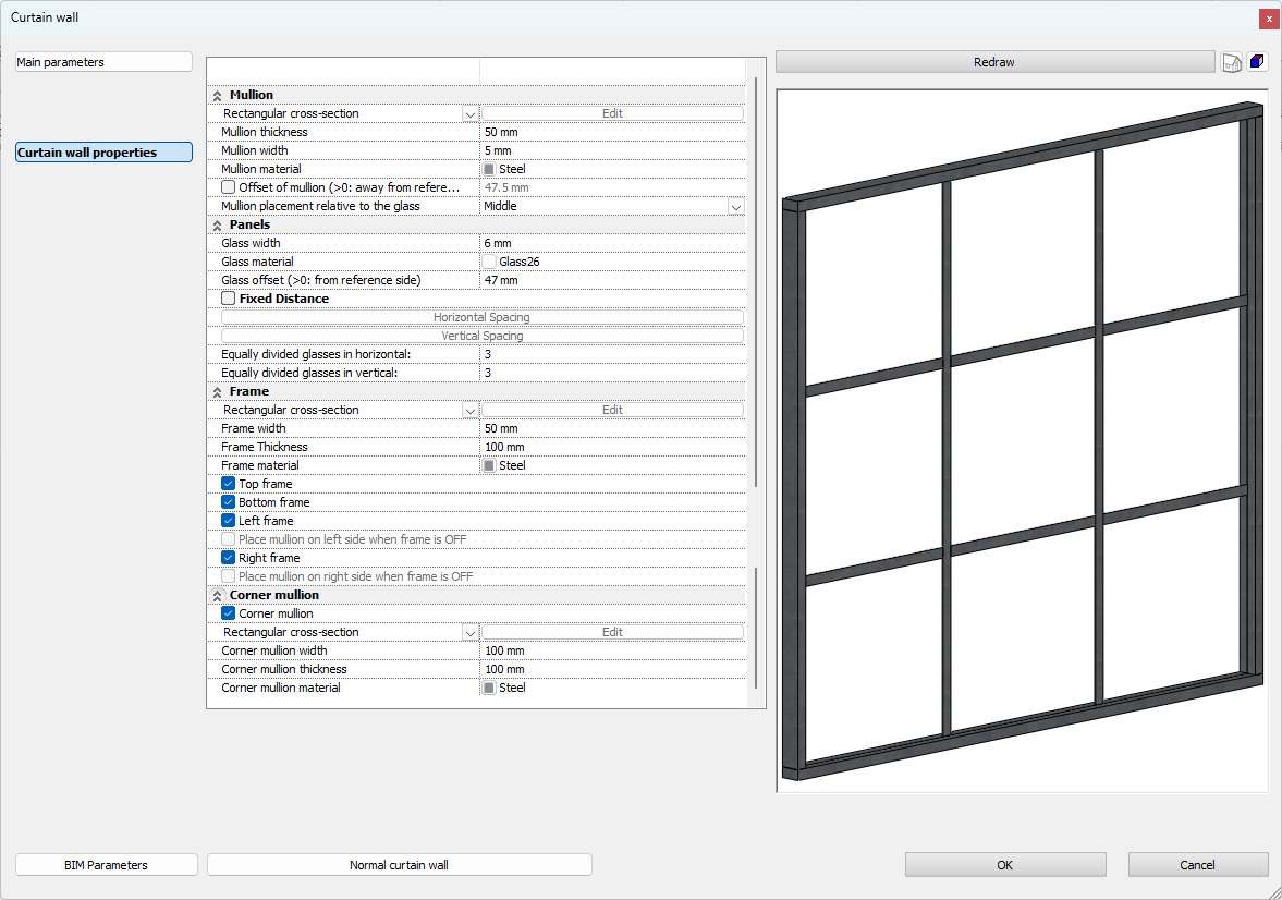 Shows a real-time 3D preview of the curtain wall with mullions, glass, and frames.