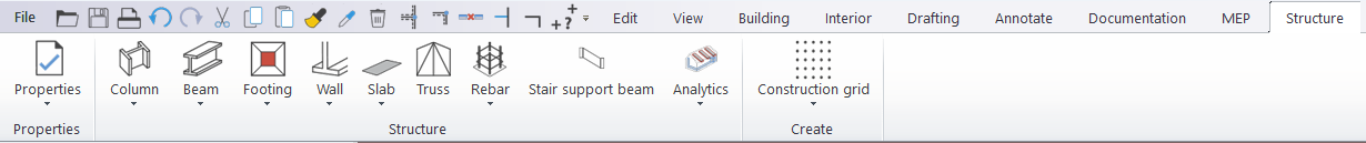 The architectural functions collected on the Structure tab support a clean and transparent design workflow. The following commands are available: