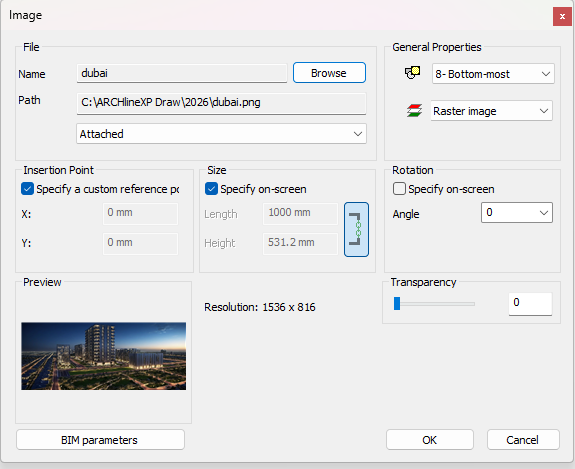 | Transparency | Controls the transparency of the image. Attention! With the same value in the Draw order, the image file has lower priority than the drawing elements, meaning the drawing elements will be visible. |