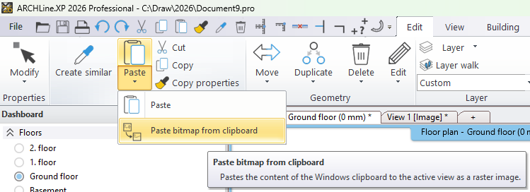 3. Copy & Paste: E.g. from Paint. Select an image or a part of an image and press Ctrl+C. Go to ARCHLine.XP and use Edit > Paste > Paste btmap from clipboar to paste it into ARCHLine.XP.