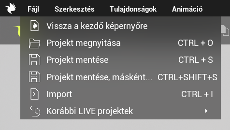 - Megnyitás: innen lehet megnyitni meglévő LIVE projektet a számítógép könyvtárából.