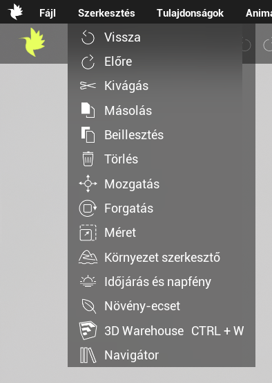 - Szerkesztő mód: bekapcsoláskor a modellben lévő objektumok, anyagok és fények szerkesztése lehetséges.