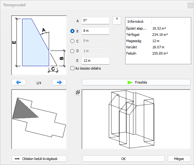 A tömegmodell párbeszédpanelben részletezheti a felületek határára utaló szabályrendszert és az épület térfogatának vezérlését.