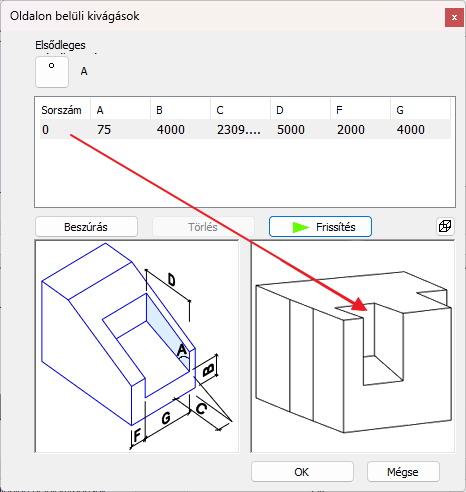 | G | Az új vágás szélessége. Ez az érték határozza meg a merőleges korlátozások helyét is a jobb oldalon. |