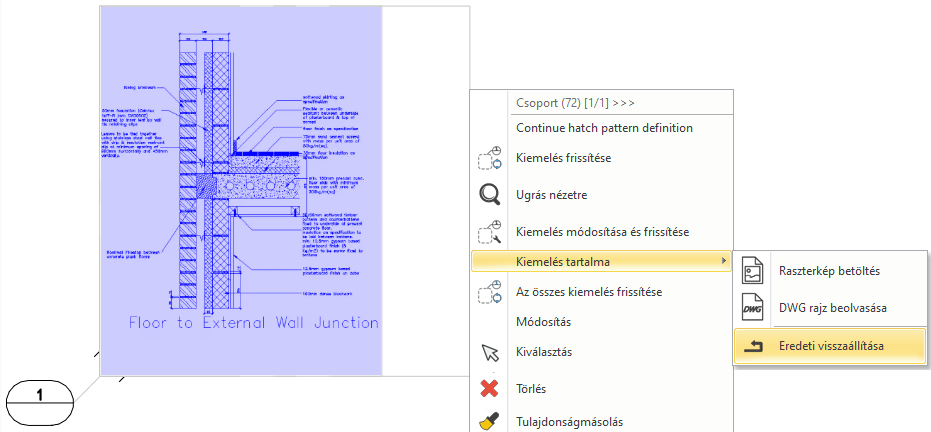 A 2023-as év újdonsága, hogy a kiemelés tartalma helyettesíthető külső tartalommal, pl. raszteres képpel vagy DWG fájllal, ezzel kivitelezési szintű ábrázolást lehet a csomóponthoz rendelni.