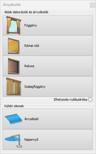 Az árnyékolók parancson belül lehet választani függönytípusok, rolók és napernyők közül. Az összes árnyékoló teljesen személyre szabható, bármilyen anyagot, formát és beállítást meg lehet adni nekik, hogy a lehető legvalósághűbb legyen a végeredmény.
