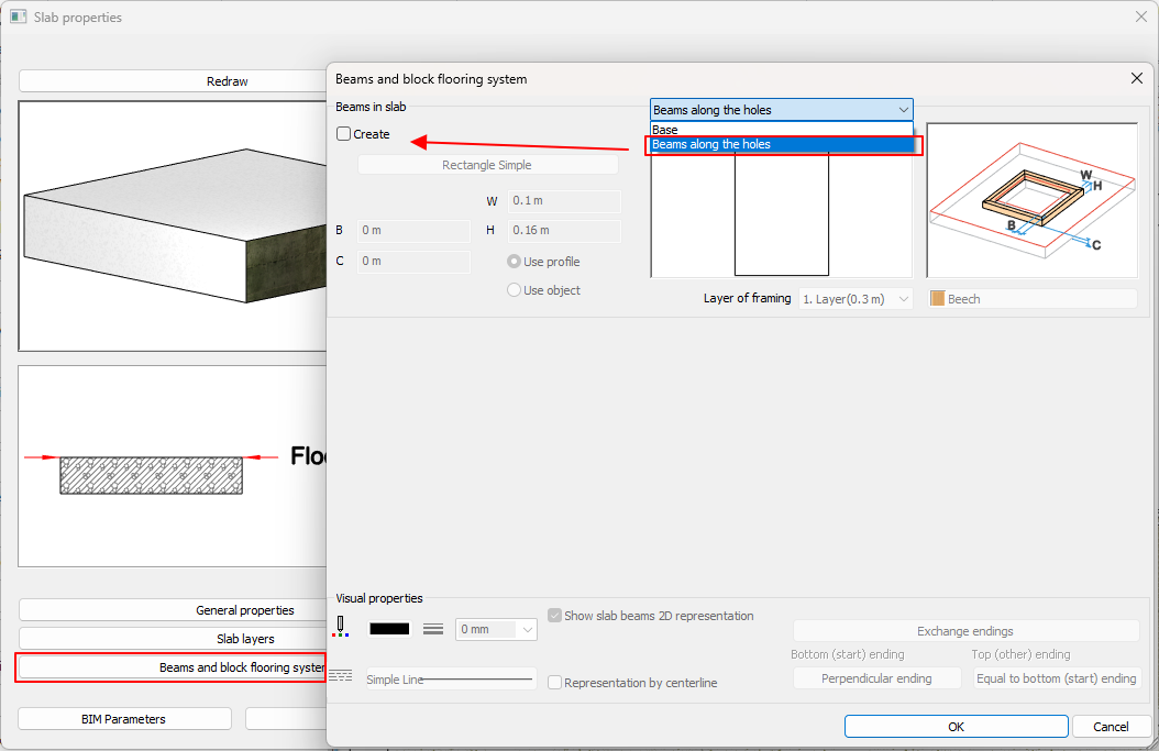 A létrehozott elemek tulajdonságainak meghatározásához használja a következő fület a Gerendák és padlórendszer párbeszédpanelen:
