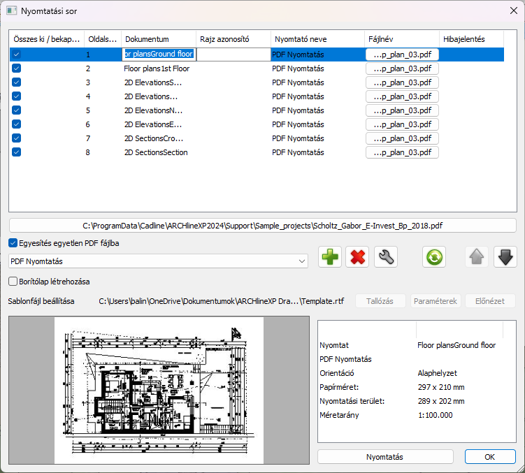 | Egyesítés egyetlen PDF fájlba | Ha aktiválja, az összes felsorolt rajzot egyetlen PDF-fájlban egyesíti. |