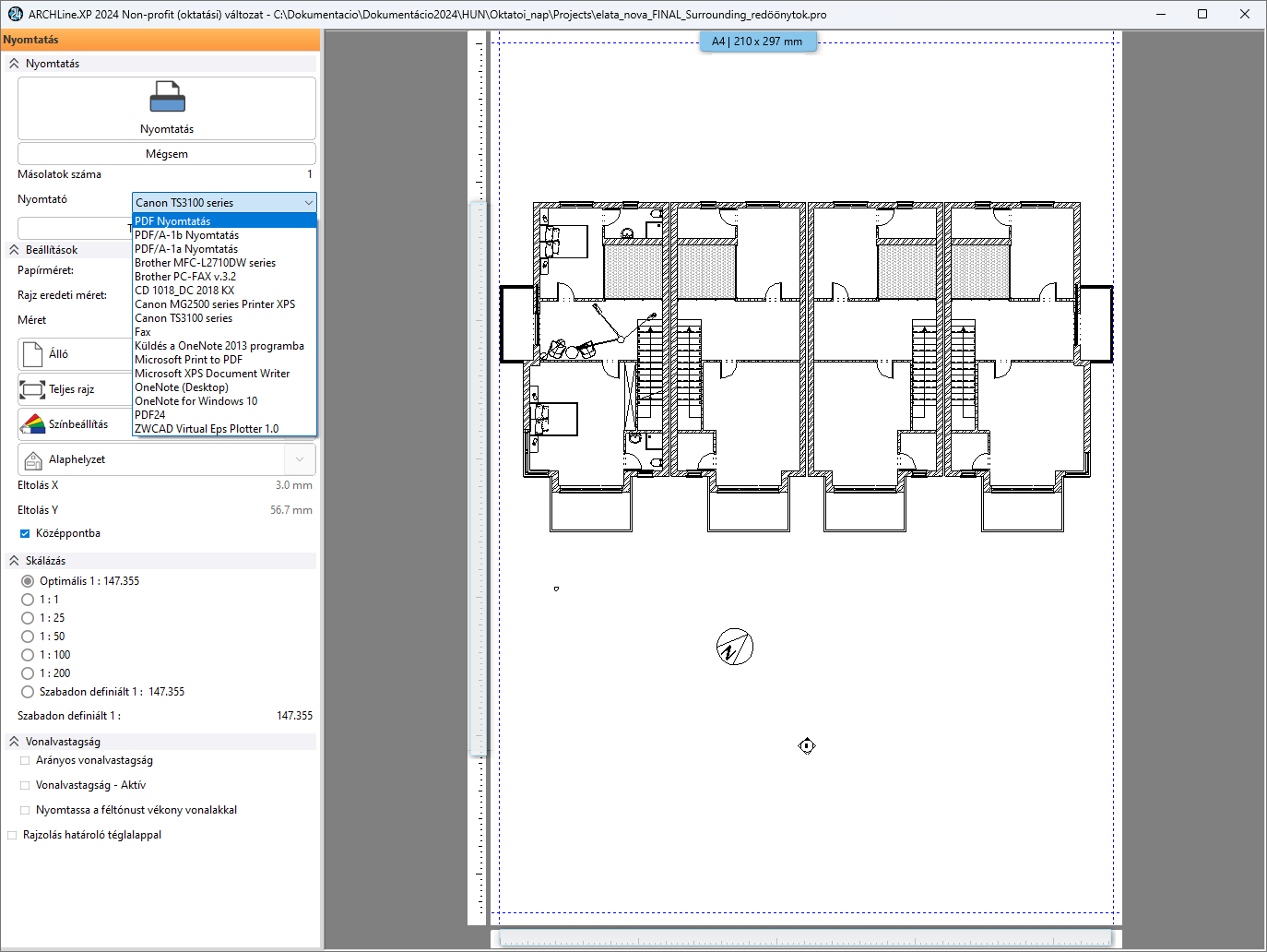 Válassza ki a nyomtatót a Nyomtató kiválasztása listából. A PDF nyomtatás az első helyen szerepel. Kiválasztása után az ARCHLine.XP alapbeállitásnak tekinti a további nyomtatásokhoz egy futtatás alatt.