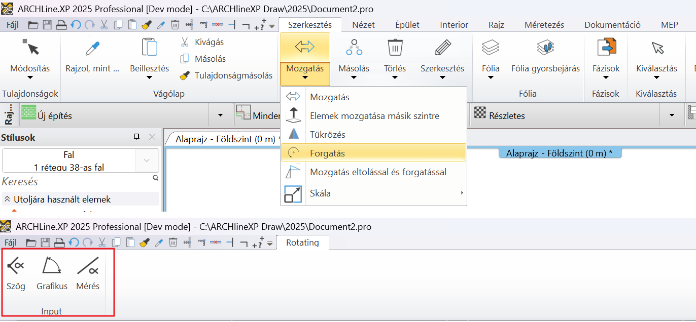 - Új Pontfelhő parancs - Faldetektálás a pontfelhő alaprajzi megjelenítésén.