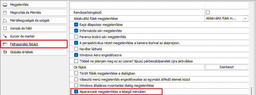- A lebegő menük be- és kikapcsolhatók. Elhelyezkedés: Beállítások - Felhasználói felület - Alparancsok megjelenítése a lebegő menüben
