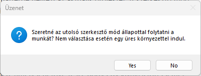 - A szerkesztő mód megörzi az elözö állapotát ezért a következő inditáskor választani lehet hogy az edigi modellt töltse vissza vagy üres környezettel induljon.