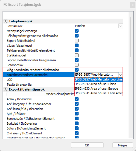 Jelölje be a „Világ koordinátarendszer alkalmazása” jelölőnégyzetet a párbeszédpanelen. Ez azt jelenti, hogy az IFC fájl az IfcProjectedCRS és IfcMapConversion csomópontokkal lesz exportálva, amelyek leírják a georeferenciát. Ha ez a jelölőnégyzet nincs bejelölve, az azt jelenti, hogy az IFC fájl csak a projekt koordinátáival lesz exportálva.