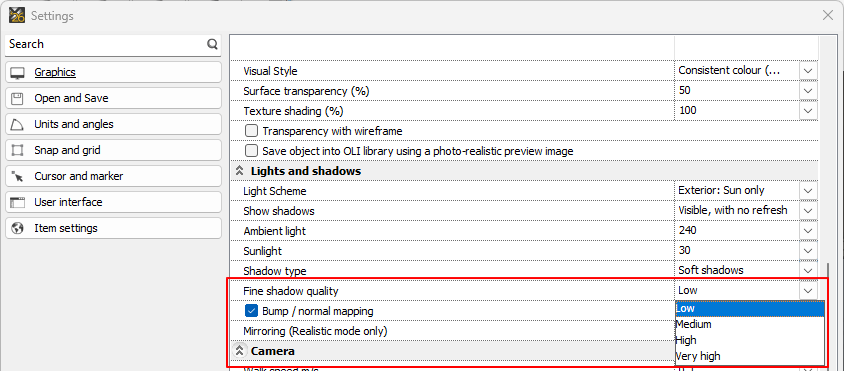Az Árnyék felbontás beállítás a Beállítások menüben található: